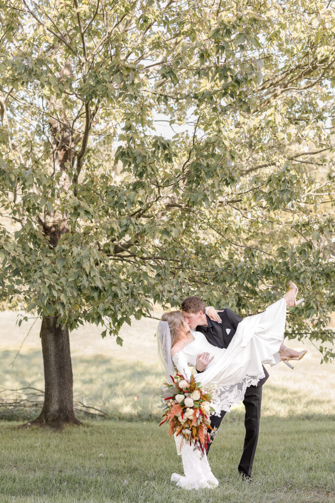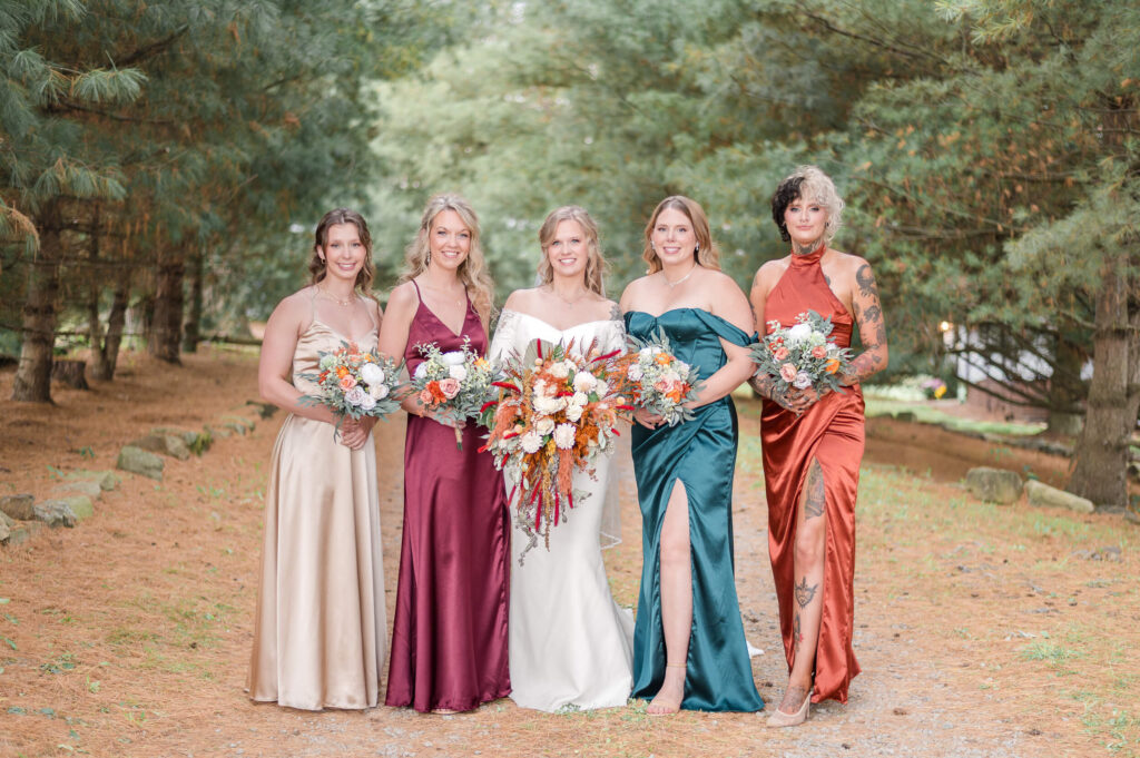 The Barn at Whispering Pines offers several lovely spots for portraits. The gravel drive lined with tall pine trees is a favorite for many couples because it feels private and peaceful. In addition, this spot works beautifully for first looks or bride and groom portraits after the ceremony. The light filters softly through the branches, adding a romantic glow to every photo.