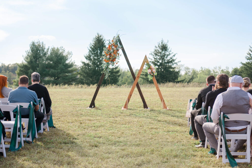 One of the best parts of The Barn at Whispering Pines is that the entire day can take place in one location. The outdoor ceremony site overlooks meadows and a tree line that changes beautifully throughout the year. As a result, couples can exchange vows surrounded by natural beauty and open fields.